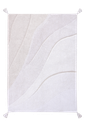 Alfombra lavable en hilos mixtos Marfil, Natural y Gris Perla, formando un patrón de suaves tonos. Líneas estrechas de tejido base visible entre capas y pompones de algodón en cada esquina de hilos mixtos.